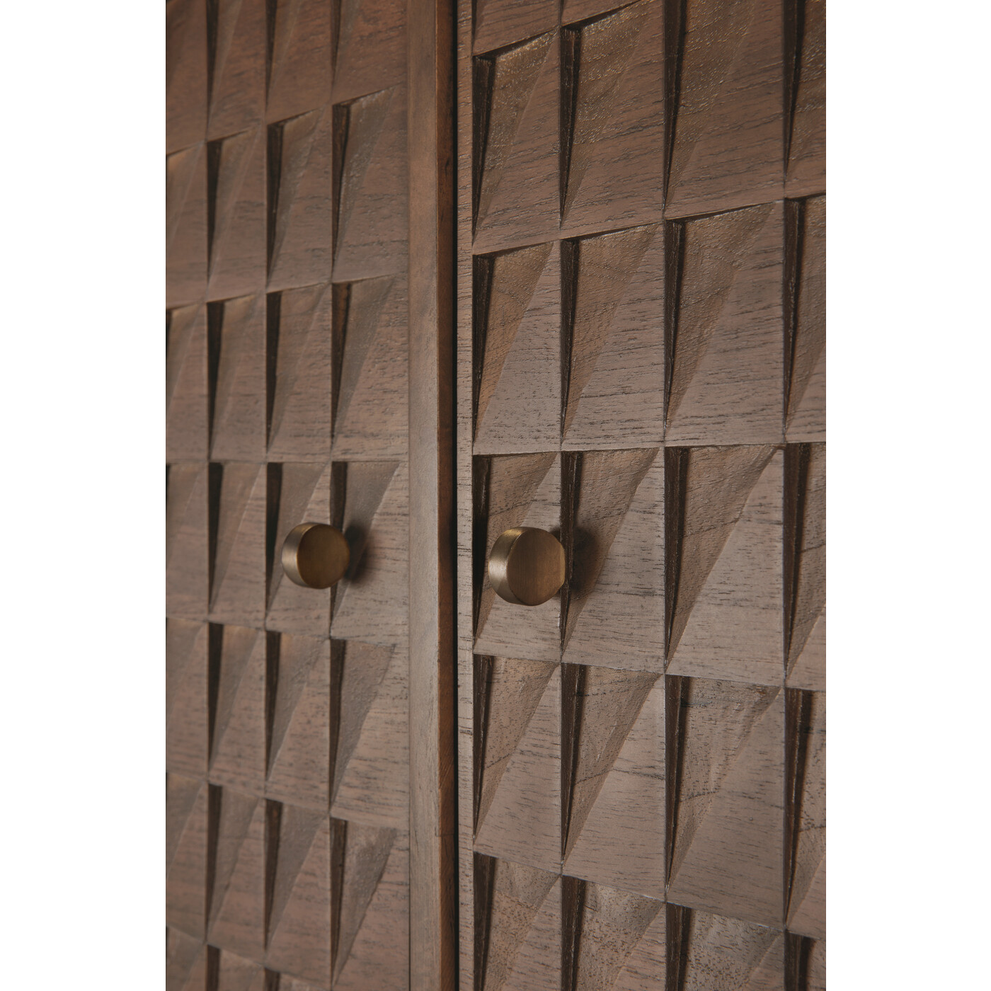 Sono propose une gamme inspirée des antiquités et de l'élégance moderne. Cette collection raffinée présente des panneaux sculptés à la main, cachant un espace de rangement fonctionnel derrière un esthétique classique. Comprend 2 portes, 3 tiroirs à fermeture douce et des étagères intérieures ajustables. Fabriqué en teck massif teinté marron clair avec une finition vernie.