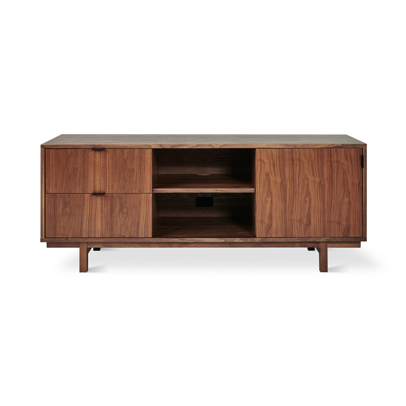 Features 2 drawers and 1 sliding door (on a black aluminum track) with black metal pulls. Compartments have adjustable shelves for efficient storage. Opening at the back of adjustable shelf and back panel for cable management. Clear coat finish. Recessed wood base is solid ash with a walnut finish. Plastic bumpers on all legs to protect hardwood floors.