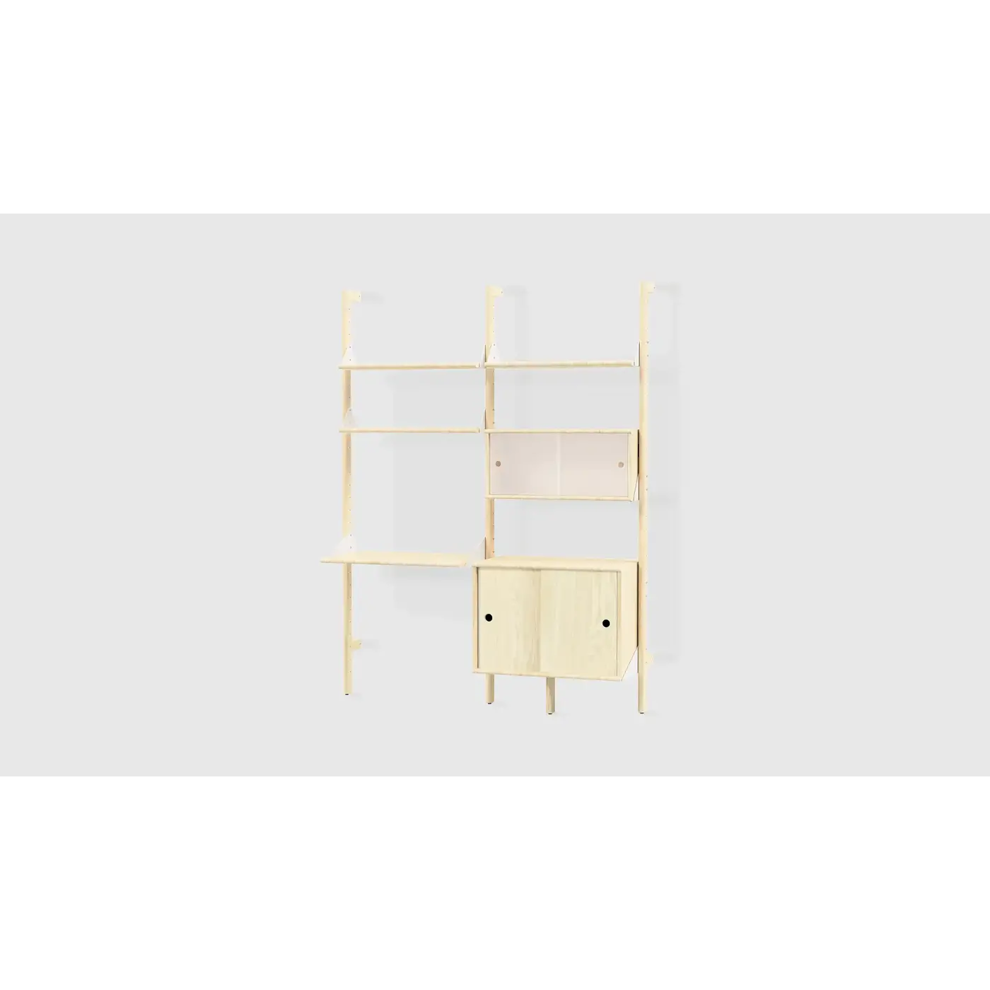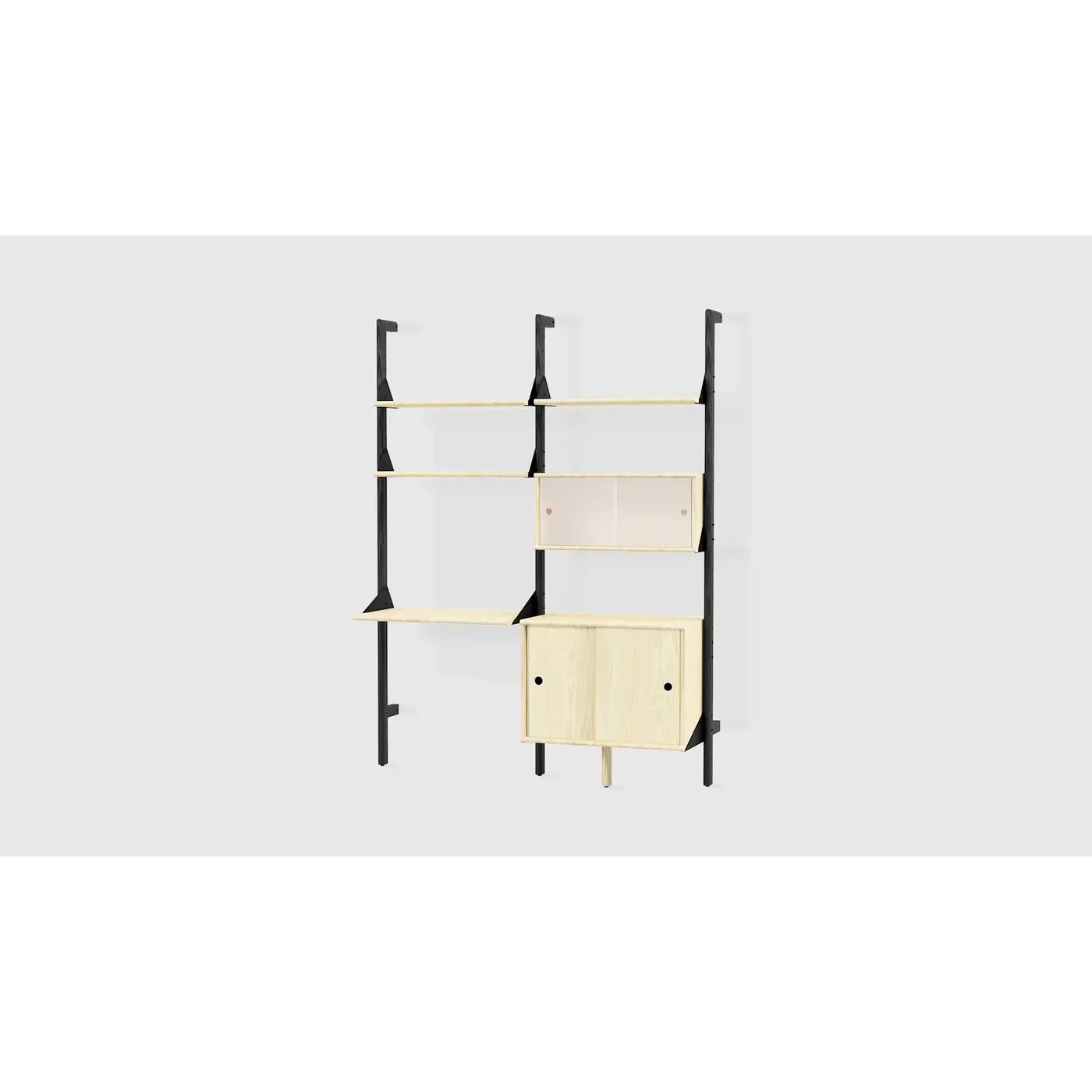 This « Multi-storage + desk » configuration features three open shelves, a deep shelf that functions as a work surface, one small cabinet, and one large cabinet with sliding frosted acrylic doors. Together, they form a complete workstation that maximizes organization while maintaining a clean, structured aesthetic. Perfect for creating a discreet home office nook or a polished professional workspace.