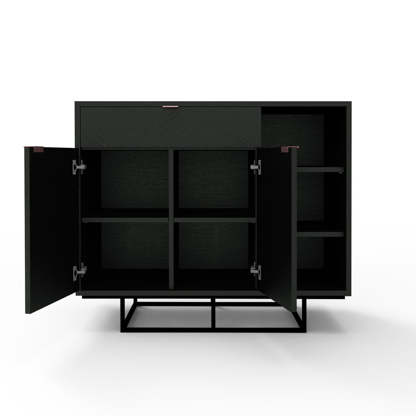The Myles Cabinet combines subtle details and craftsmanship to create a storage design that exudes simple sophistication. Rose gold handles contrast dark stained, chevron-patterned oak faces. A recessed, slender steel base with black, powder-coated finish creates an illusion of weightlessness. Adjustable shelves in the interior compartments and open storage area provide plenty of efficient storage space allowing this design to maximize functionality in a smaller and taller footprint.