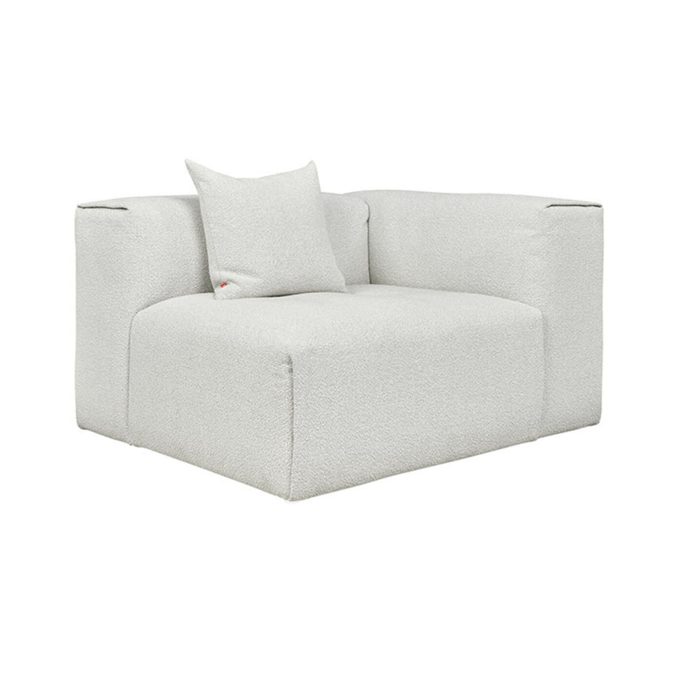 Endless configuration options with five core modules (left section, right section, corner, armless chair, ottoman). Discreet, sturdy connectors for a stable setup. Scandinavian-inspired design with a low profile, clean lines, and textured bouclé fabric. Premium sterilized feather fill for superior comfort. FSC®-certified hardwood frame, sustainable and durable. Fully compatible with all Nest modules, adapting to your evolving needs.
