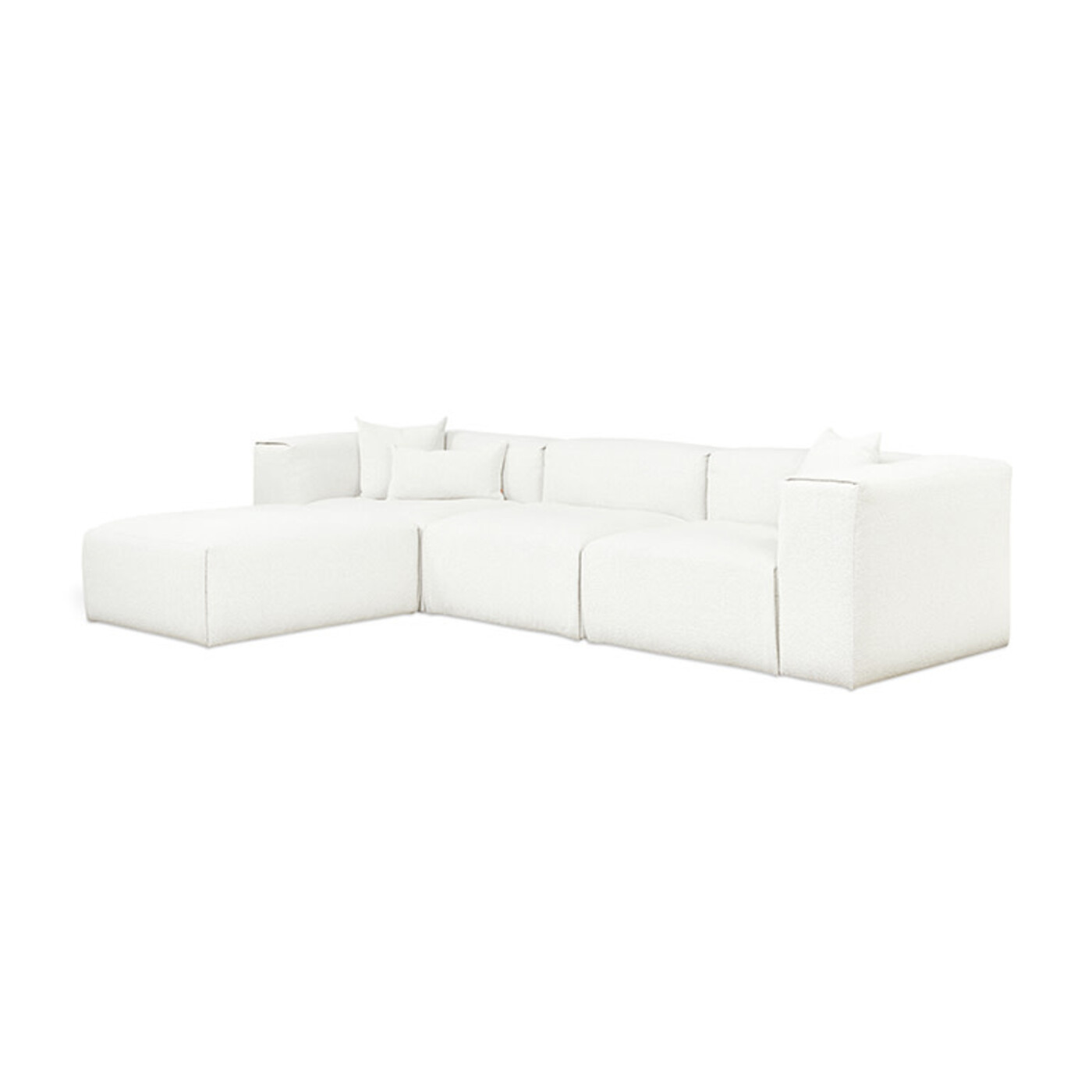 Endless configuration options with five core modules (left section, right section, corner, armless chair, ottoman). Discreet, sturdy connectors for a stable setup. Scandinavian-inspired design with a low profile, clean lines, and textured bouclé fabric. Premium sterilized feather fill for superior comfort. FSC®-certified hardwood frame, sustainable and durable. Fully compatible with all Nest modules, adapting to your evolving needs.