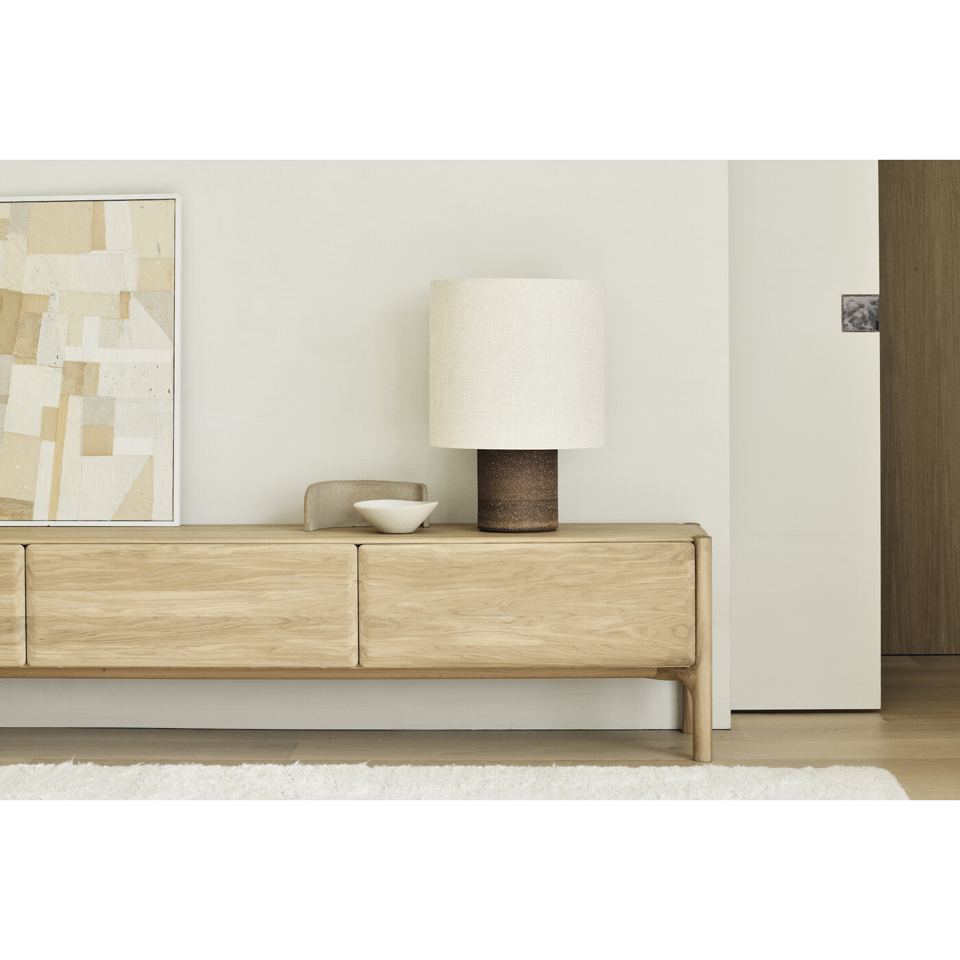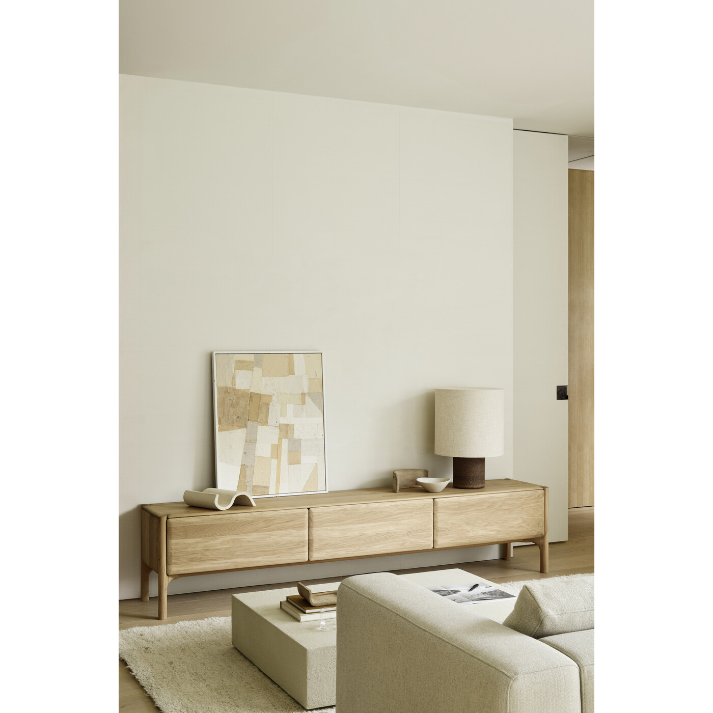 Each PI item is finished by hand to ensure that the individual character of the wood is respected. The PI TV cupboard is striking and unique, with practical storage to complement the lounge space. This PI TV cupboard features 1 flip-down door and 2 drawer. Made from solid oak with a hardwax oil finish.