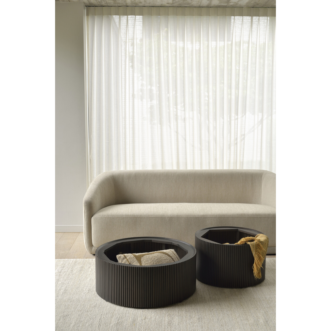 Encapsulated in its stacked wood-stick effect, the tabletop can be easily removed to hide the newspapers, toys, cushions and throws from daily life. The perfect solution for smaller living.