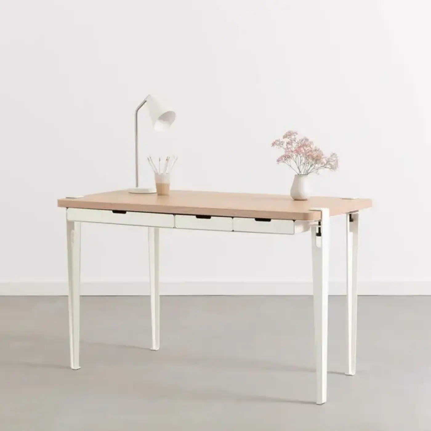 The TIPTOE desk is composed of steel table legs 75cm high, a wooden table top 120x60cm and drawers for extra storage space.