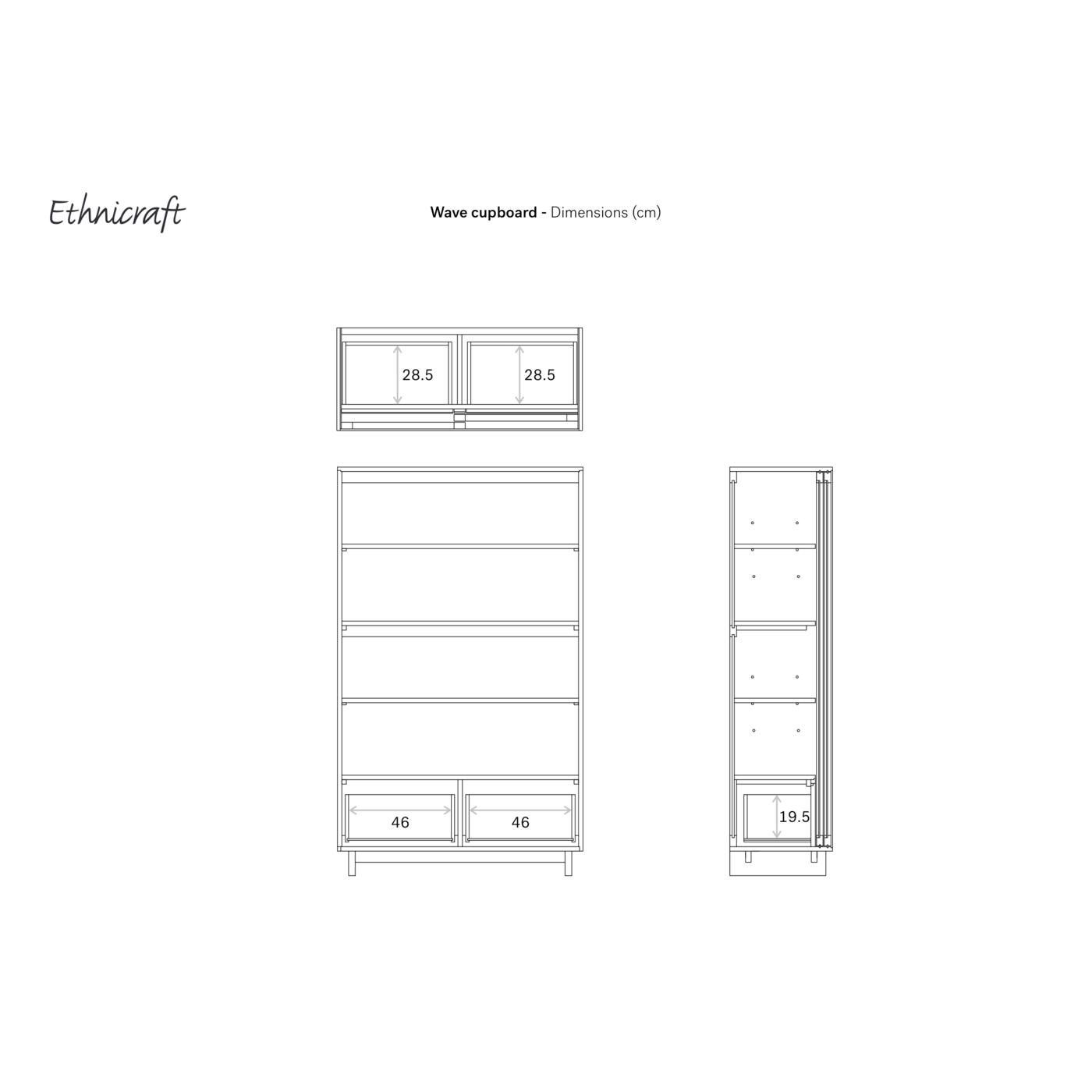 Made of solid wood, this storage cupboard’s doors and drawers have no handles and feature a soft closing mechanism. The Wave storage cupboard features 2 sliding doors in tempered glass, and 2 drawers.